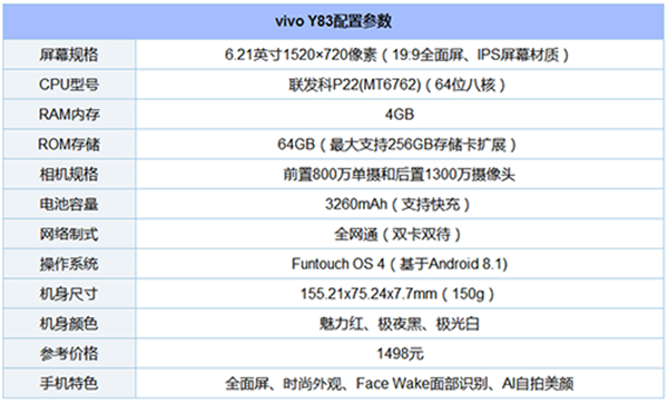 核心硬件方面,vivo Y83也是国内第一款搭载联发科Helio P22处理器处理器的手机。