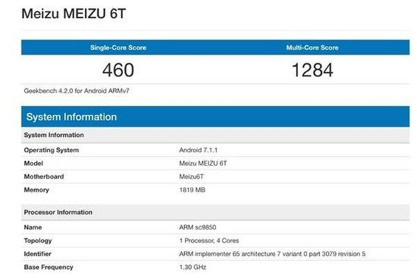 魅蓝6T处理器怎么样目前,GeekBench 的数据库中已经出现了这款新机的跑分成绩。该机型号为 MEIZU 6T,搭载的是展讯的处理器——SC9850,跑分成绩比较低,单核分数仅为460,多核分数为1284,和骁龙400 系列相比还有一定的差距。
