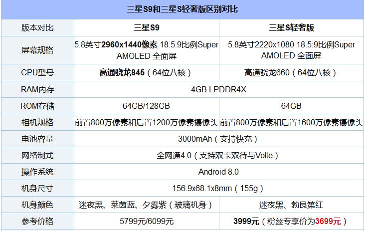 三星S轻奢版只有4+64GB版,售价3999元,粉丝专享3699元,相比5799元的三星S9,相当于便宜了2000元左右。