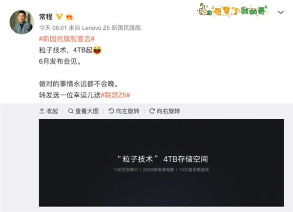 联想Z5手机什么时候上市据消息了解,联想常程发微博宣布称:“粒子技术,4TB起,六月发布会见。做对的事情永远不会晚。”️这就意味着,联想Z5将在6月份举行发布会,而储存空间最高达到了4TB。