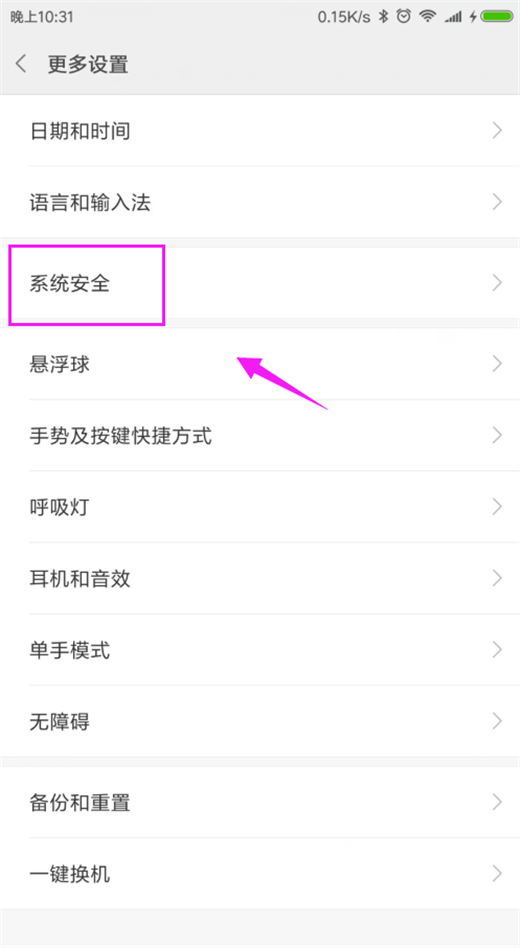 第三步:在【更多设置】界面,我们选择【系统安全】选项,如图。