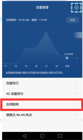 2、点击【流量管理】进入如下界面后选择【应用联网】,设置应用程序的联网权限。为了节省流量,可以关闭不需要的后台联网应用程序。