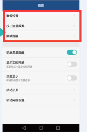 点击套餐设置:设置上网流量套餐及提醒。手机每月会统计已用和剩余的流量,并在套餐限额用完时进行提示或断网。