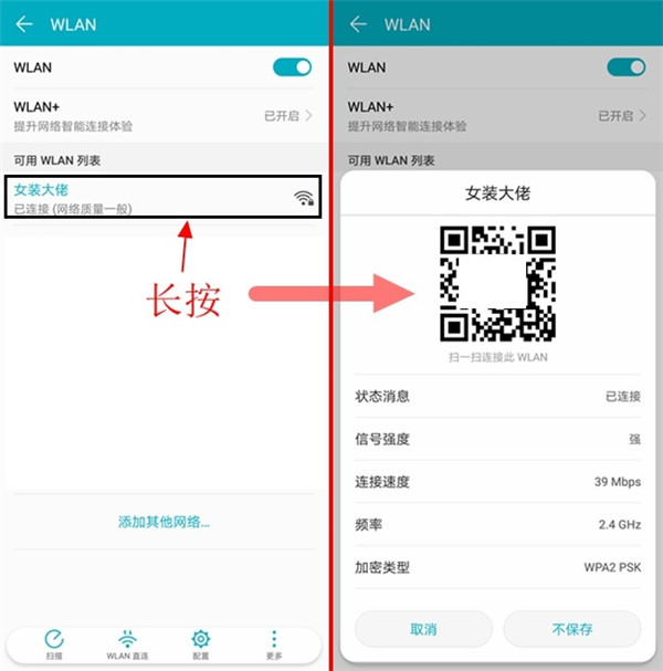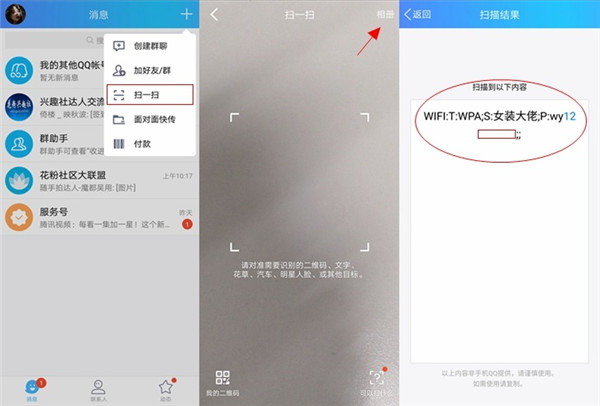 之后,用QQ微信等扫一扫就会出现WIFI名称和密码了。可以用别的手机扫描,也可以保存图片到本机后再点击识别二维码(如下图)