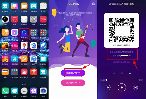 ️方法二:连接好WIFI之后,打开手机上的“Party模式”APP,点击创建音乐PARTY即可看到当前的WLAN名称和密码啦。