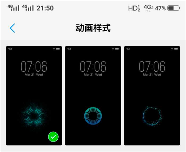 第四步:在指纹界面,选择【动画样式】,可以看到里面一共有三种动画样式可以选择,我们选择其中的一种即可;