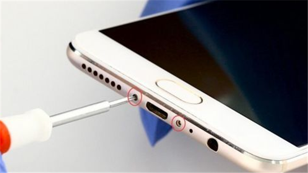 3、使用六角螺丝刀,将手机下方的这两颗六角螺丝移除。PS:与平常手机有些区别,这部手机使用的时候六角螺丝。