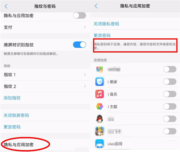 2)接着点击【隐私与应用加密】,然后就可以看到应用列表,每个应用的右侧都有一个开关,需要加密哪个只要把开关打开就行了。(如下图)