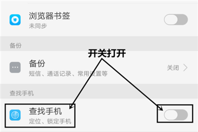 5、在云服务中,将“查找手机”开关打开,在页面最下方,其功能主要是定位和锁定手机,如图所示