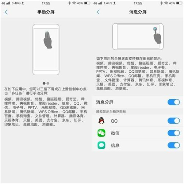 vivoY71分屏操作教程虽然这个功能早很多机型上都出现过,但是vivoY71做的却非常贴心好用,在开启功能上只需三指下滑,便可以启动分屏模式,从此我们可以一边看电影一边回复消息,一边玩游戏一边发短信。