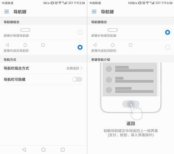 隐藏以后我们就只能使用前置指纹键来实现其他功能了,华为P10的前置指纹按键可以轻触返回,左右滑动可以唤出后台多任务菜单,小编就比较喜欢用指纹键。