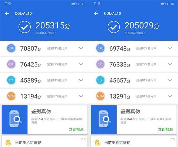 测试了2次,荣耀10安兔兔跑分稳稳的超过了20万分,相比跑分26万分左右的骁龙845旗舰机有一定的性能差距。不过,与骁龙835旗舰机跑分相当,属于目前主流旗舰机性能水准。