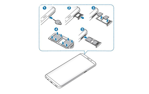 3.将SIM、USIM 或 UIM 卡的金色触点朝下放入卡托中。如果有两张SIM卡请分别放入卡槽1和卡槽2中。
