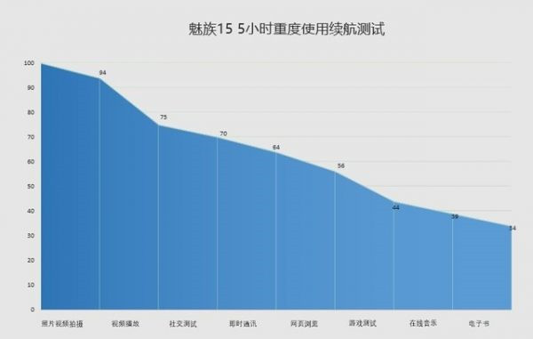 魅族15续航怎么样续航方面,魅族15的电池容量是3000mAh,因此,我们通过建立智能手机5小时重度使用模型模拟1天内智能手机使用情况,记录手机剩余电量,集中反映智能手机的续航能力。
