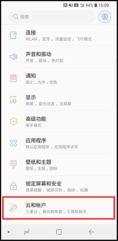 2.向上滑动屏幕,点击【云和帐户】。