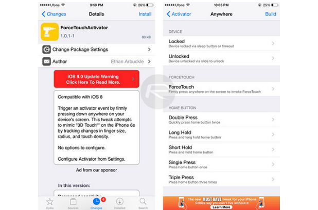 ForceTouch Activator使用的原理是使用者触摸压力为基准,也就是说,6s的3D Touch技术辨别方式有两种,一种是轻按(Peek),一种是用力按(Pop),而越狱版的则是以手指半径的尺寸以及触控的密度来进行辨别,达到3D Touch的伪功能。