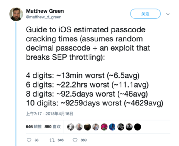据外媒报道iPhone手机的密码可以被一个小盒子轻松破解,而且最短只要几分钟。根据报道,一款名为“GrayKey”的设备可以把锁定的iPhone解锁,破解4位数的密码平均时间只要6.5分钟,而6位数的密码平均需要11小时,8位数的密码平均需要46天,10位数的密码则需要13年。虽然说苹果已经在iOS 9之后的系统中默认使用6位数的密码,并且在输错密码次数过多的时候进行了锁定的操作,不过据说这个破解方法可以绕过这些安全措施。看来我们需要将手机的密码设置的更复杂一些,才能保障安全。