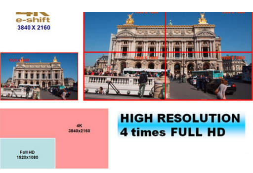 我们可以用一个比较通俗易懂的例子来解释,将4块全高清屏幕无缝按四格方块拼接起来显示4倍全高清分辨率的图像,这就是4K与全高清的差别。