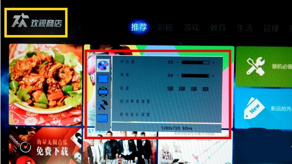调整显示器Menu菜单(类似信源键,有些显示器连上后,直接到盒子界面,有些需要调整,根据自己的设备不同操作)
