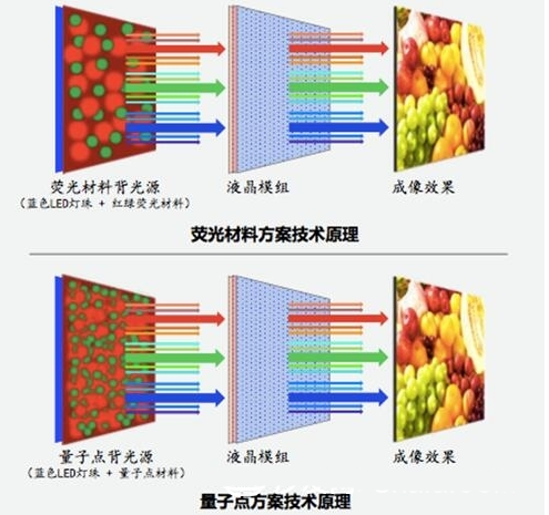 一种是荧光材料解决方案,背光灯是能够发出蓝光的LED灯珠,然后涂抹红绿荧光材料使其发出红绿蓝三原色光;另外一种是量子点技术,背光灯也是能够发出蓝光的LED灯珠,蓝光激发量子点材料后发出红光和绿光。这两种色域提升方法最大的弊端在于最终发出的红绿蓝三原色光并不纯净,因为其在提升色域的过程当中并未对红绿蓝三原色光进行提纯,所以发出的红绿蓝三原色光并不纯净。下图就是两种色域提升方式的原理图。