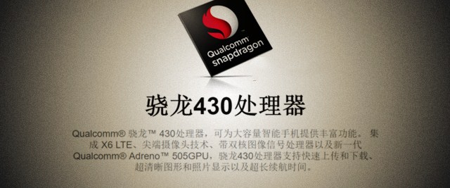 骁龙430处理器属于低端入门Soc,采用台积电28纳米制造工艺,属于8个由Cortex-A53核心组成,主频为1.4GHz。内置Adreno 505图形处理器,支持X6 LTE网络基带,仅支持Cat 4网络标准(上行150MBps、75Mbps)。规格看起来还是非常低的,至于表现如何就看接下来的跑分性能测试了。
