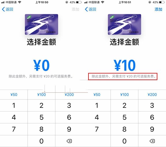 3、小编就以上海交通卡为例,进行开通和充值。我们发现默认的充值金额有50元、100元和200元。当然了我们也可以自己自定义充值自己想要充值的金额,最低10元起步。值得一提的是,当输入金额之和,系统有一个文字提示,除此金额外,另需支付20元的可退服务费,说白了就是需要额外支付20元押金,如图所示。