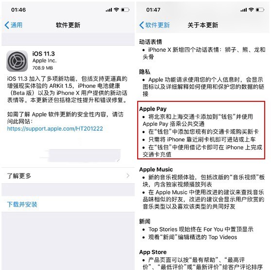 此次带来的iOS11.3正式版带来的更新内容还是蛮多的,如ARKit 1.5、iPhone电池健康(Beta版)。而最令小编激动的是可以“将背北京和上海交通卡添加到‘钱包’中并使用Apple Pay搭乘公共交通”,这句话也就是说果粉用户可以手持iPhone乘坐公交地铁的功能正式上线,目前暂时支持北京和上海两个地区,后续还是新增中银通支付(合肥通)、重庆通、深圳通、苏州市民卡、武汉通、岭南通等地区的公交卡。