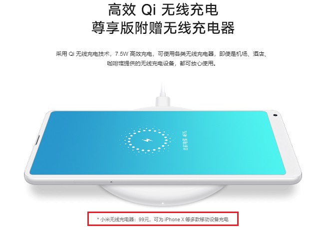 小米MIX 2s支持的Qi无线技术与苹果iPhone X支持无线充电规格一样,均为7.5W。