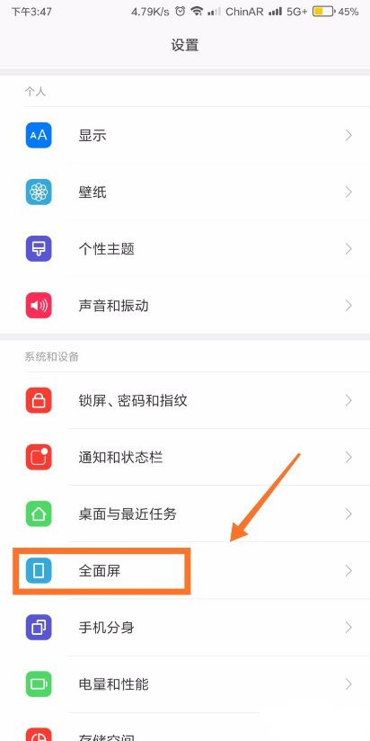 1、进入手机【设置】,往下滑找到【全面屏】选项,点击进入;