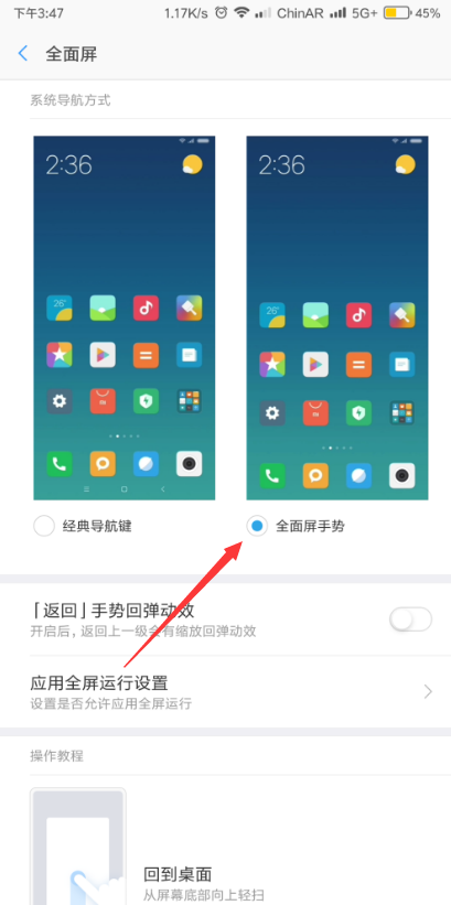 2、进入【全面屏】界面后,将【经典导航键】取消,点击选择【全面屏手势】;