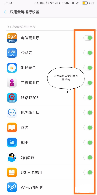 3、打开下方【应用全面屏运行设置】,可以对单个程序进行个性设置,把需要全屏的软件开关打开即可,如果你用某个软件的时候不方便用全面屏手势,就可以将这个软件的全面屏手势给关闭了。