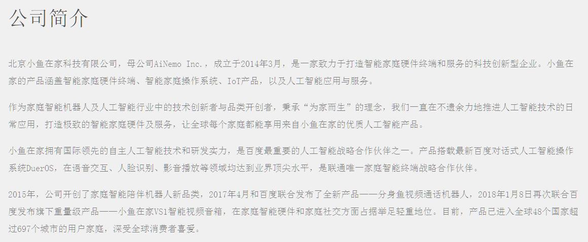 因此大家可以明白小度在家只是一款智能音箱产品,它背后的公司名则叫小鱼在家。