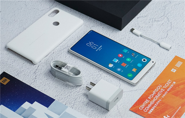 包装内,包括一部小米MIX 2S、电源适配器、Type-C数据线、3.5mm耳机转接线以及定制手机壳。