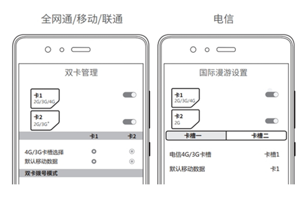 3.在设置 > 国际漫游设置(电信版本)或设置 > 双卡管理(全网通版本/移动版本/联通版本)中,根据需要选择 4G 卡槽设置,轻松切换 4G 网络。