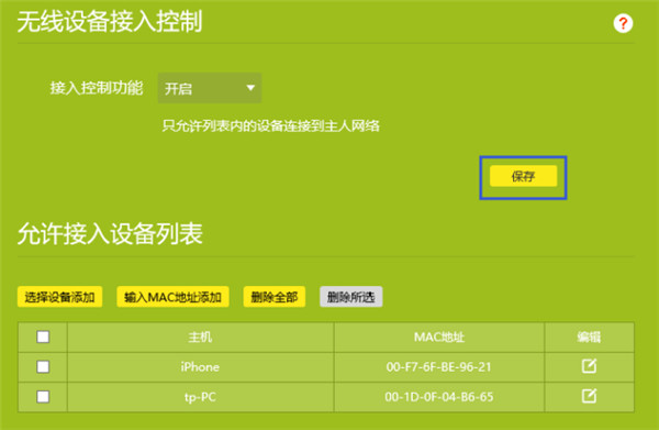 返回无线设备接入控制页面后,点击️“保存”。