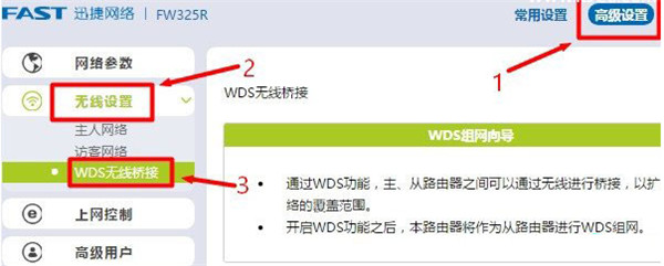 在路由器主界面点击️“高级设置”—“无线设置”—“WDS无线桥接”,点击下一步。