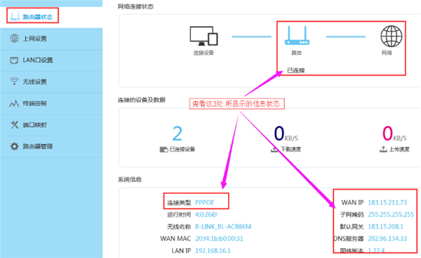 检验路由器连接状态,在️“网络连接状态”一栏如果显示️“已连接”说明路由器已经设置成功。