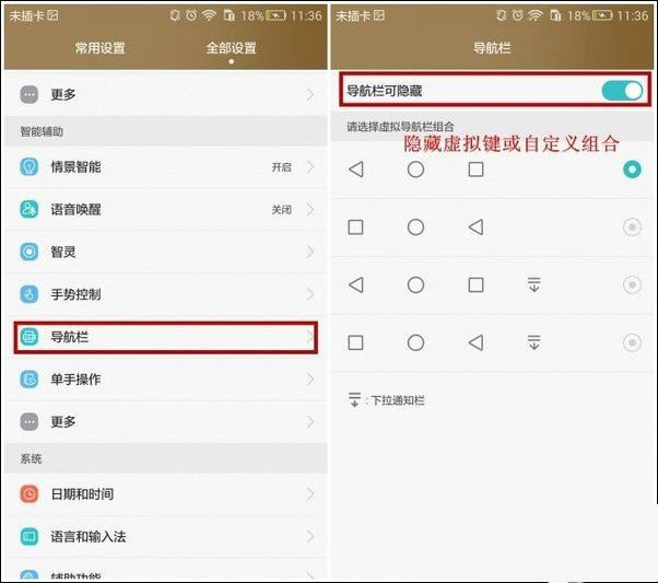 3、将“️导航栏可隐藏”打开,然后选择虚拟按键自定义组合方式,根据你平时的使用习惯来定义虚拟键,即可。