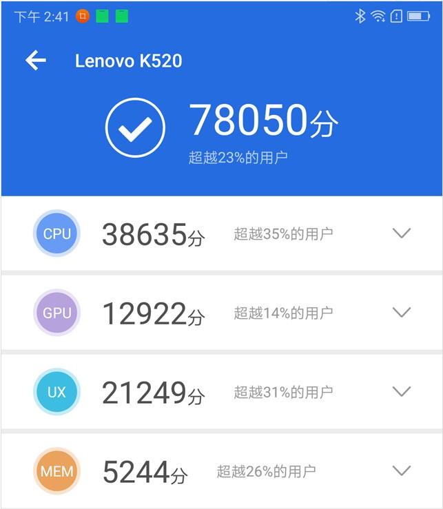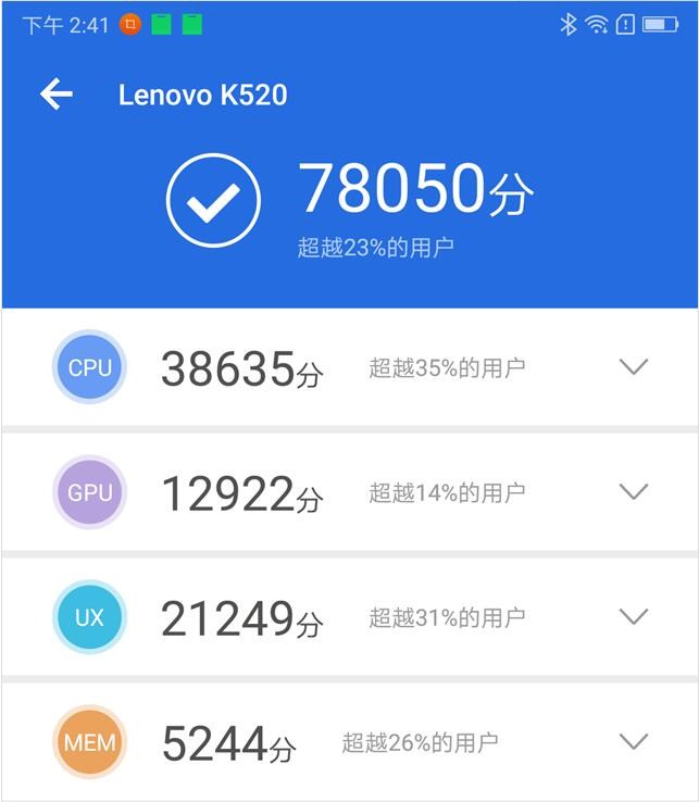 通过跑分测试得知,这款联想S5跑分成绩为78050分,这样的跑分手机算是骁龙625手机里面最好的,还是蛮意外的。