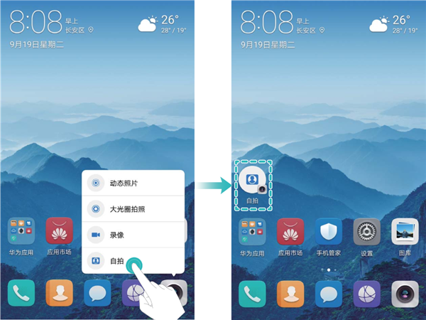 ️添加桌面快捷方式到桌面:在主屏幕,长按应用图标,在应用弹出常用功能后,长按常用功能并拖动至桌面,即可建立快捷方式。例如您可以将相机的自拍功能添加快捷方式到桌面,点击即可启动自拍。