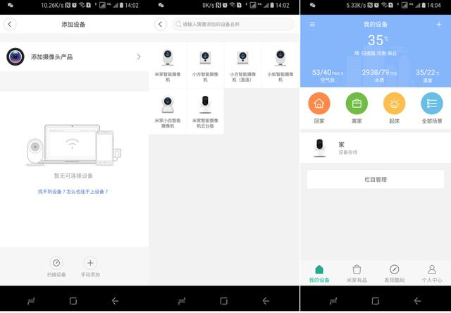 扫描说明书上的二维码下载“米家APP”,安装打开后登陆账户,如果此时你已经把摄像机连接了电源的话,会弹出检测到米家智能摄像机云台版的提示,当然,如果不在提示里进行连接的话,也可点击主页右上角“+”号选择添加摄像头产品,米家智能摄像机云台版,按照提示即可成功连接。(需要注意的是,建议WIFI名称不要太长)