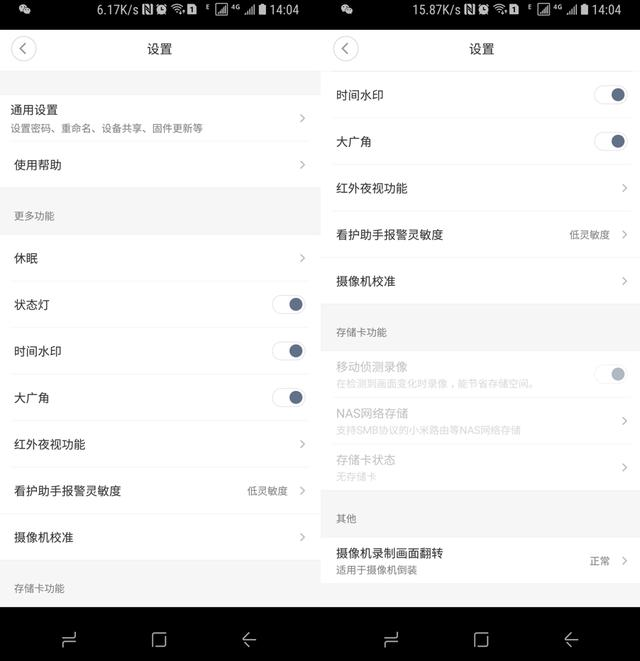 米家智能摄像机云台版的设置项里有很多让你更方便自己的设置选项,在通用设置中可以设置每次打开监控时的密码,如果购买了多台摄像机的用户,还可以设置每一个摄像机的名称,固件更新,一键分享给其它用户观看等功能也在其中,除此之外,休眠、状态灯、时间水印、大广角和红外夜视功能与看护助手直接在第一级就可以选择。