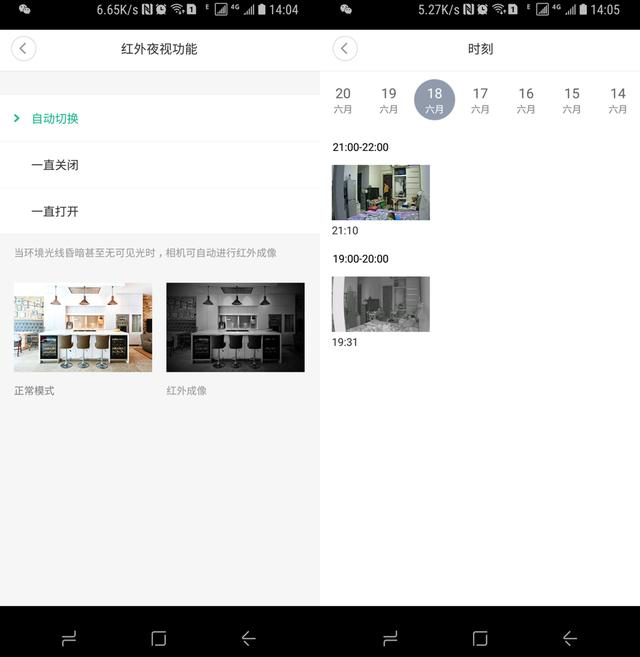 米家智能摄像机云台版的红外夜视功能与看护助手可以满足在任何光线环境下的安防监控需求,这一点也是最让我满意的,通过上图相信大家也可以看到,在室内不开灯的晚上,红外夜时的监控同样清晰,而上图中的两段视频,就是看护助手自动生成的录像,在设置界面调整好灵敏度之外,在主界面点击右下角第一个图标,即可进行看护时间段的设置,当在监控时间范围内画面中有移动的物体出现时,会直接生成一段10秒的视频上传至云端(如果插入了SD卡也会本地存储一段)并第一时间手机通知预警。