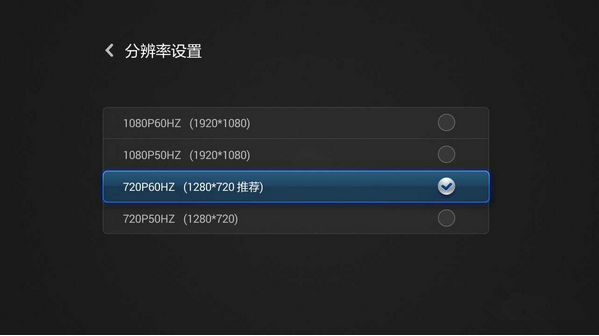 4.选定后小米盒子将为您设置常用的4种分辨率模式:1080P60HZ、1080P50HZ、720P60HZ与720P50HZ。在选定一项设置之后,界面将自动跳转到预览页面,用户可以根据此时的显示决定是否使用该设定。