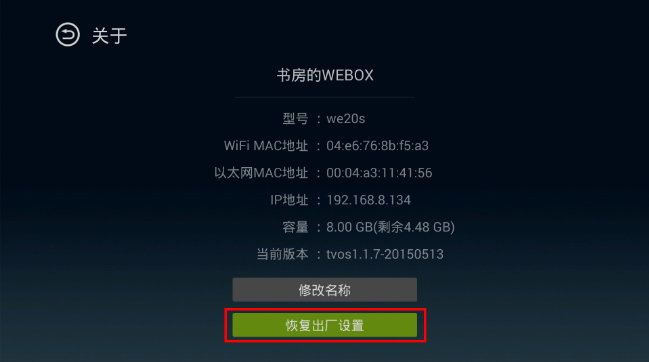 然后就看到恢复出厂设置的按钮啦!但是要注意,恢复出厂设置会让盒子原有的所有数据都清空哦!