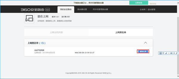 打开上网黑名单界面后,在要解除拉黑的设备后面,点击解除拉黑。