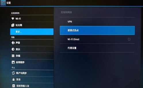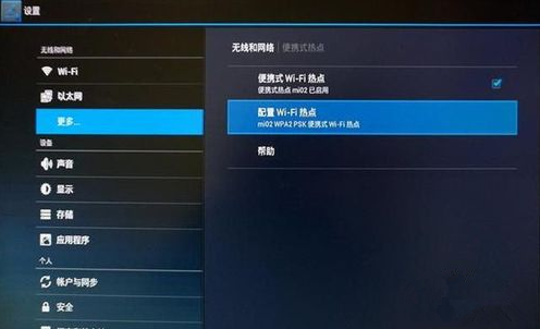 进入设置页面后,就跟手机的设置基本一样了,依次选择“无线和网络”然后点击“更多”最后选择“便携式热点”,就可以进入我们的WIFI热点的配置了。