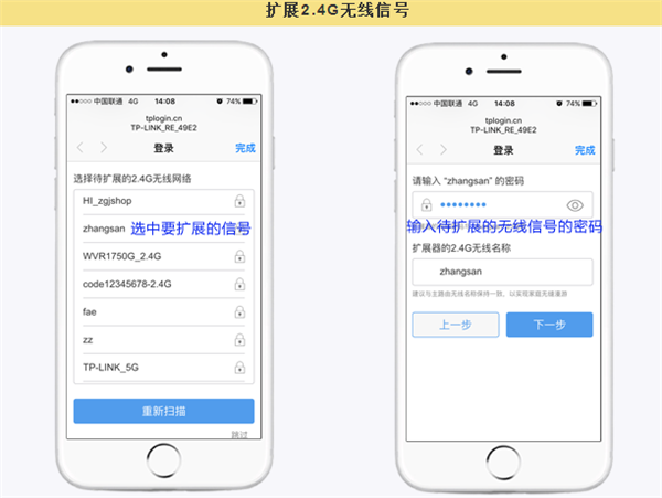 进入扩展器设置界面,扩展器会自动扫描周边信号,在扫描到的信号列表中找到要扩展的信号,选择并连接信号。