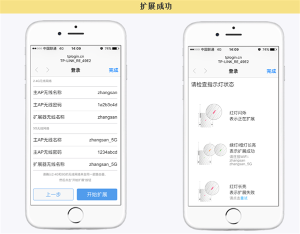 扩展成功后,扩展器的出厂默认信号消失,发射的无线名称和密码与原先路由器的信号完全一样,无线终端搜索到扩展后的信号即可上网。