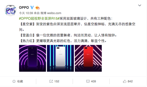 今天,OPPO官方微博公布了OPPO R15的设计海报,并称该机采用双面玻璃设计,共有三种配色。星空紫,渐变的紫色由深至浅层层晕开,似星空般神秘,充满无尽的想象空间;雪盈白,像一位优雅的芭蕾舞者,纯洁而灵动,让人情有独钟;热力红,更耀眼更具光彩的红色,活力满满,彰显个性。